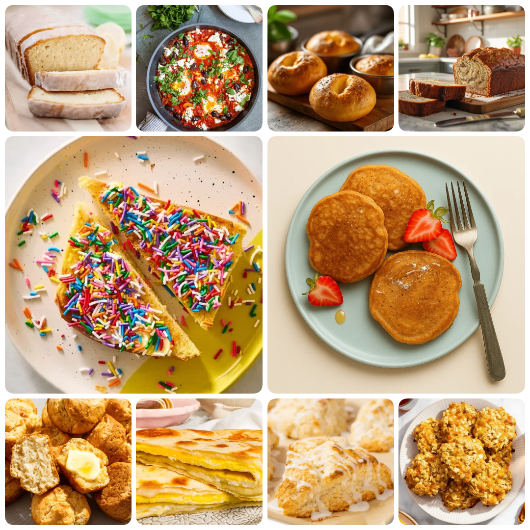 Collage of easy breakfast ideas including glazed lemon pound cake slices, shakshuka with feta and herbs, Brazilian cheese bread rolls, sliced banana bread, sprinkle toast, small pancakes with strawberries, quick muffins, a folded egg tortilla, lemon glazed scones, and apple oat cookies.