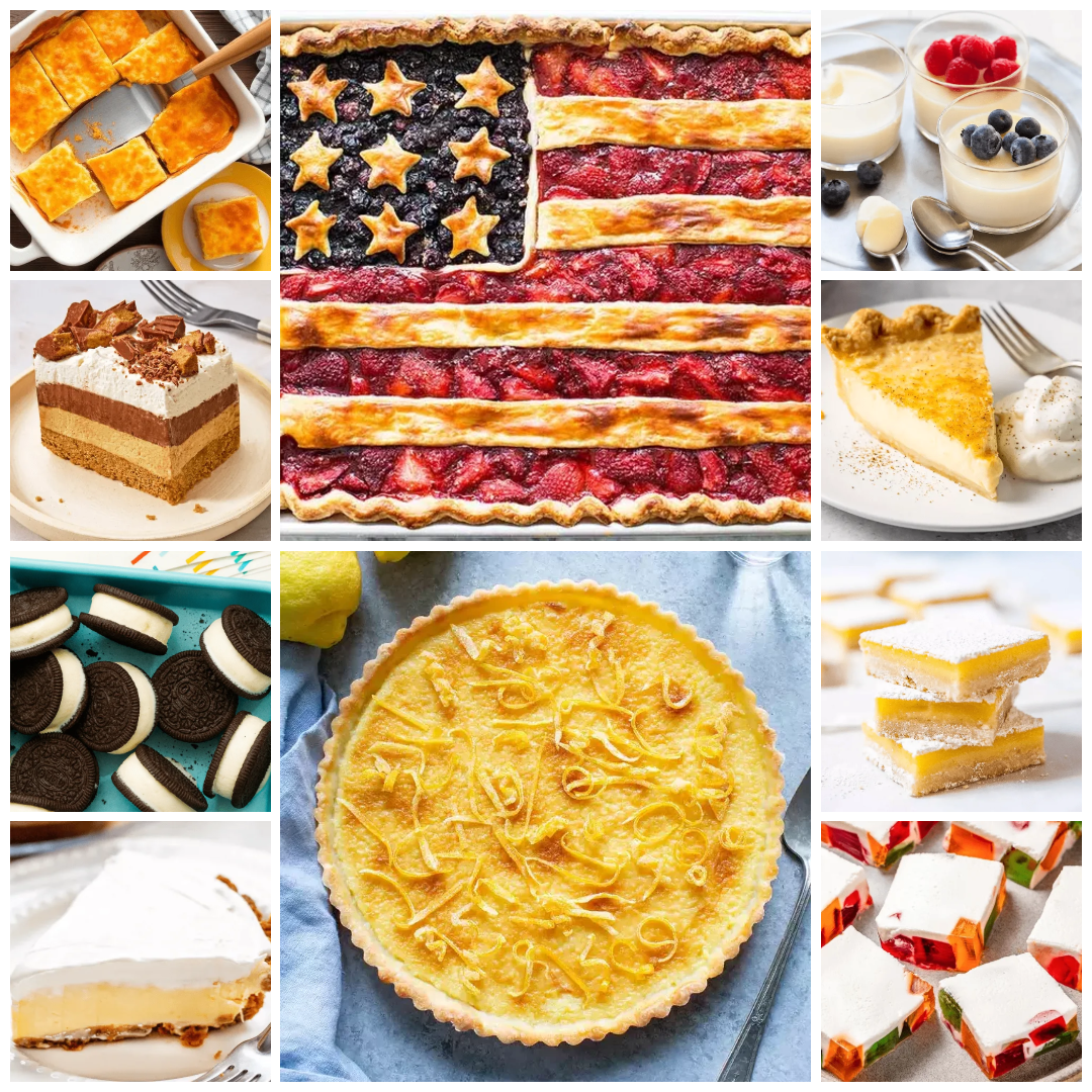 You will find something here for every kind of kid and every kind of grown up too. Want clean slices and less mess? Go for lemon bars, lemon tart, or icebox pie. Need a make ahead hero that chills while you handle dinner? The pudding, broken glass jell o, and no bake chocolate peanut butter layers have your back. Planning a party table that looks impressive without complicated decorating? The flag pie slab brings the wow, while ice cream sandwiches keep serving simple and stress free.