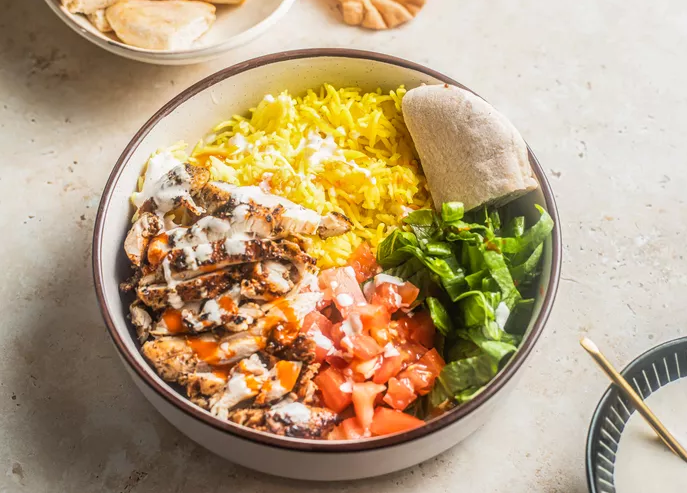 A realistic at home example: When I batch cook, I will often double the rice, cook the full amount of chicken, and make a slightly larger jar of white sauce. The first night we eat halal cart chicken over rice in bowls. The next day, I load leftovers into meal prep containers with extra lettuce and call it lunch. On the third day, any remaining chicken becomes wraps with extra hot sauce for whoever wants the spice.