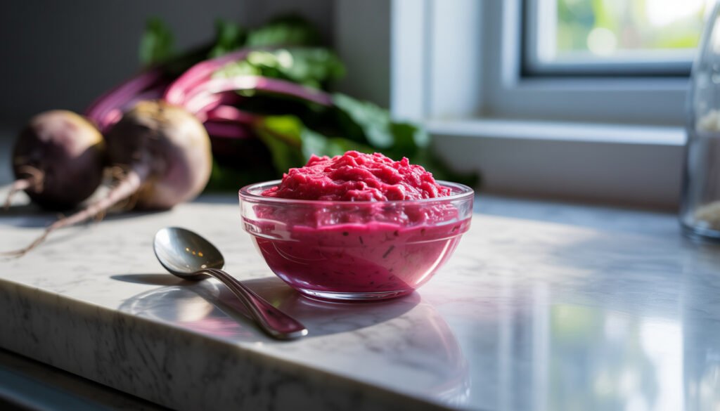 - Beet Horseradish (Chrain): Fold in ½ – 1 cup finely grated raw or cooked beets for color and sweetness – excellent with brisket or smoked fish.