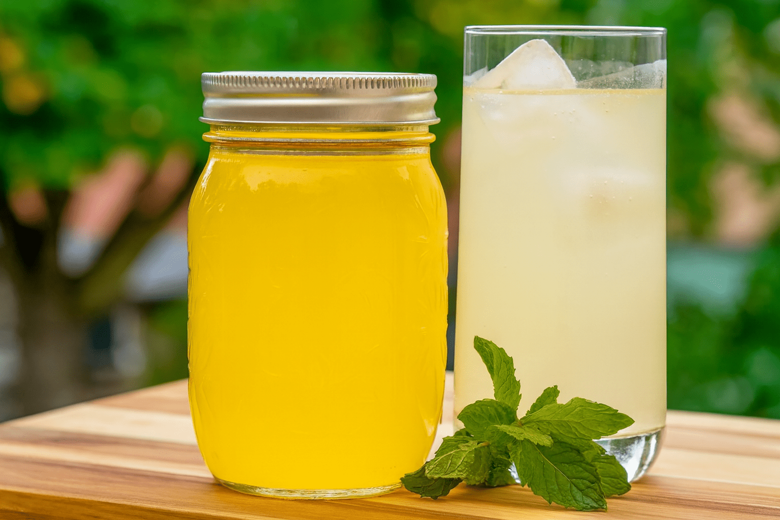 Homemade citrus mint summer beverage base in a glass bottle on a sunny table, surrounded by fresh mint
